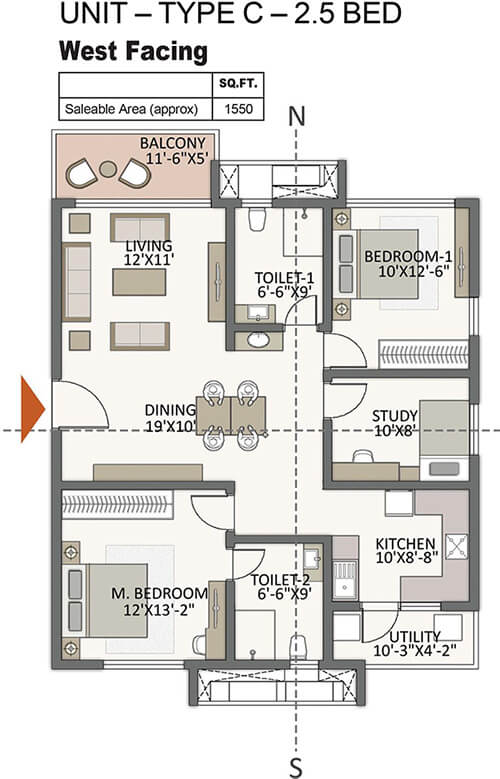 1 bed plus (West): SBA: 1184 sq. ft; Carpet area: 796 sq. ft; 3 Balcony and utility: 5 sq. ft. It is available in tower 10.