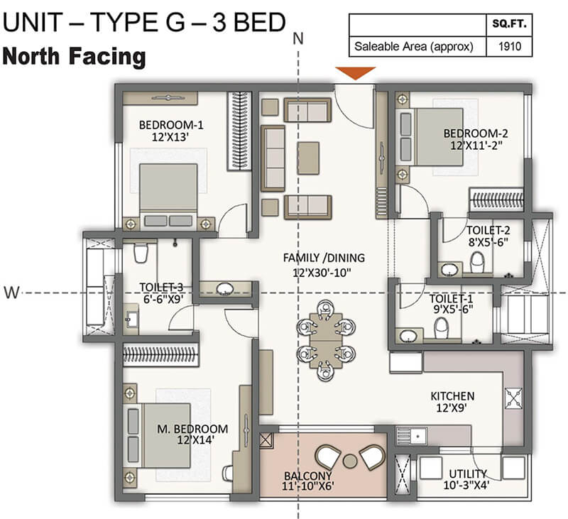 3 Bed Prima (North): SBA: 1898 sq. ft; Carpet area: 1223 sq. ft; Balcony and utility: 119 sq. ft. It is available in towers 04 and 06.