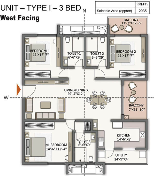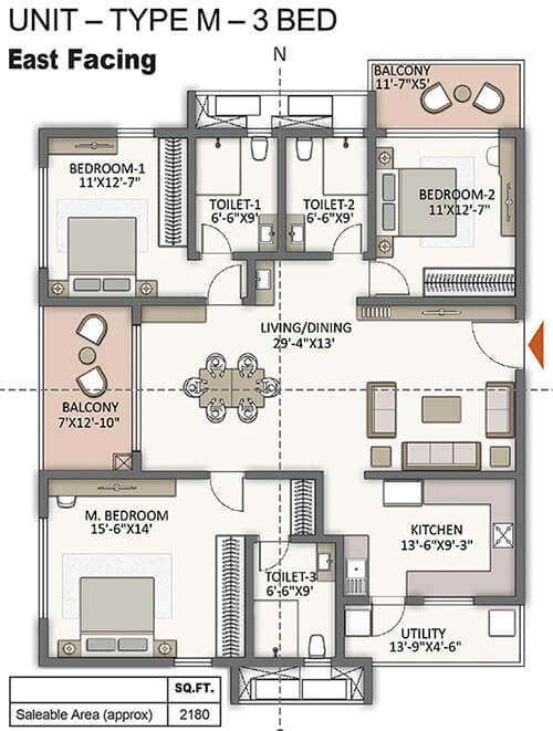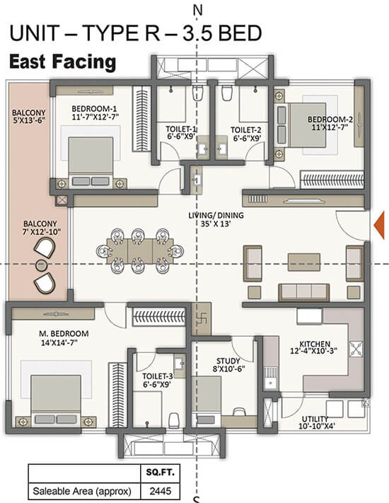 The township offers five variants of floor plans for 4 BHK apartments. The residents can choose apartments that are east or west-facing.