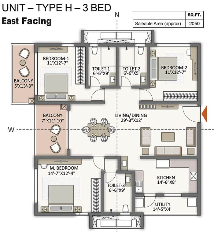 2 Bed, East facing: SBA: 1179 sq. ft; Carpet area: 716 sq. ft; Balcony and utility: 103 sq. ft. It is available in towers 4, 6, and 7.