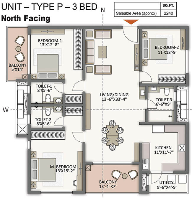 3 BHK apartment floor plan of The Prestige City Hyderabad